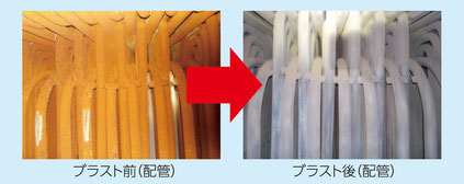 ボイラーにスケールが付着して熱効率が落ちており、熱効率改善のためスケール除去をしたいが、従来の人為的作業でのスケール除去では時間と労務コストがかかったり、手の届かない場所の除去ができなかったり、除去ムラができてしまいます。水洗浄ではしっかり乾燥させないと腐食が進行してしまう恐れがあり採用が難しい状況です。