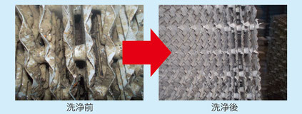 まず、スラッジを採取し、分析室で成分分析を実施しました。成分分析の結果、スラッジの成分は炭酸カルシウムが主成分と判明しました。そこで、化学洗浄でスラッジ成分を除去・軟質化し、その後に高圧洗浄を行いました。今回はスラッジが大量だったので、充填材を取り外してから高圧洗浄を行いました。本洗浄の結果、スラッジの除去に成功し、冷却効率の上昇に成功しました。
